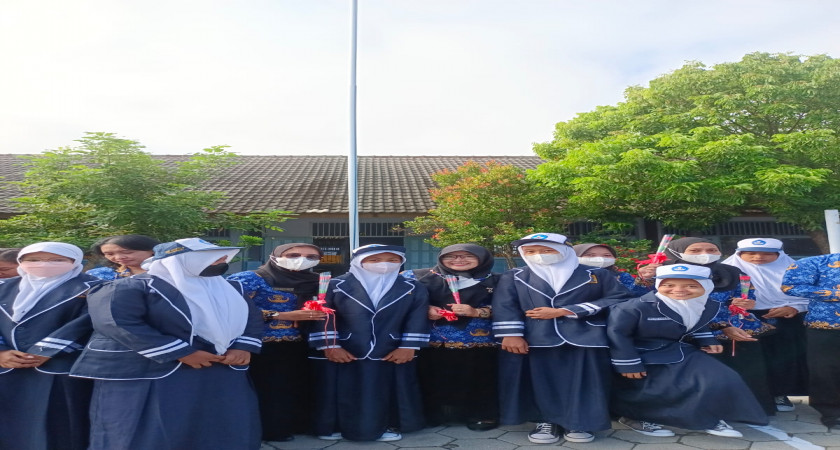 Peringatan Hari KORPRI di SMP Negeri 3 Tasikmadu, Peserta Didik Memberikan bunga Kepada Guru
